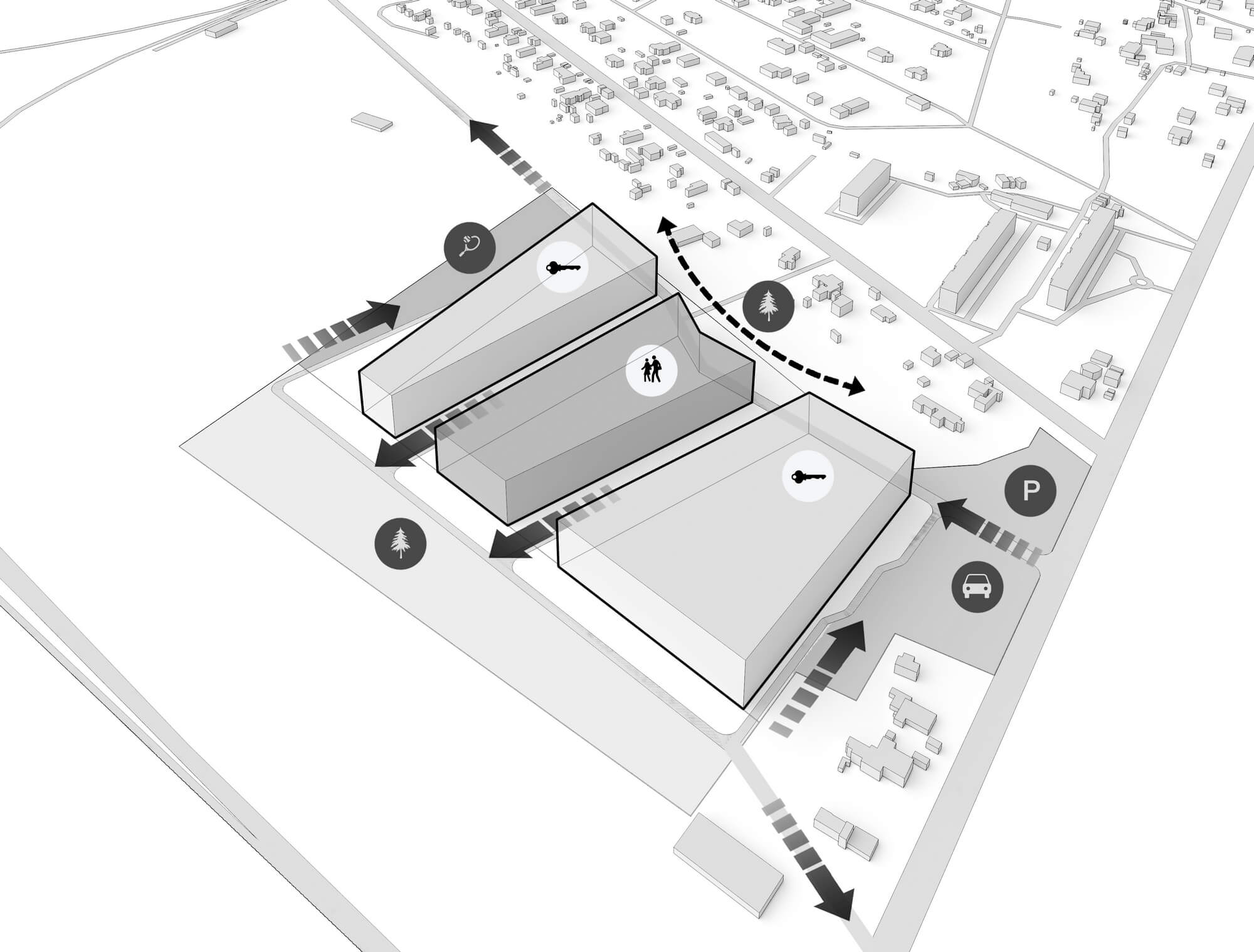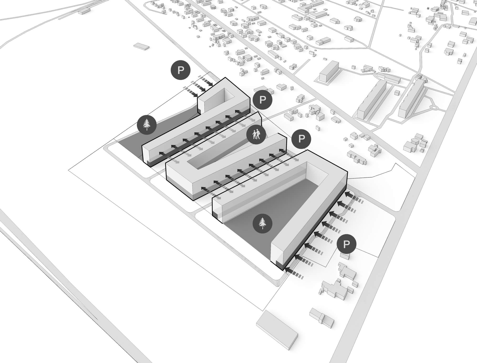 Приоритетами ставятся обеспечение жителей квартала недорогой комфортной средой с элементами природного ландшафта, пешеходными маршрутами и связью с существующим торговым центром, плоскостными спортивными сооружениями, достаточным количеством собственных и гостевых парковочных мест и создание «центра притяжения» для соседнего малоэтажного района.
