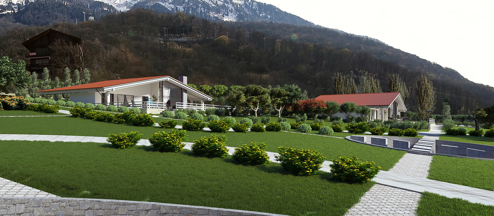 Коттеджный поселок расположен на горнолыжном курорте Красная Поляна, рядом с комплексом для прыжков с трамплина Русские Горки и горнолыжным комплексом «Горки Город». Железнодорожная станция Эсто-Садок находится в 5 минутах ходьбы, 42 км до международного аэропорта Сочи.