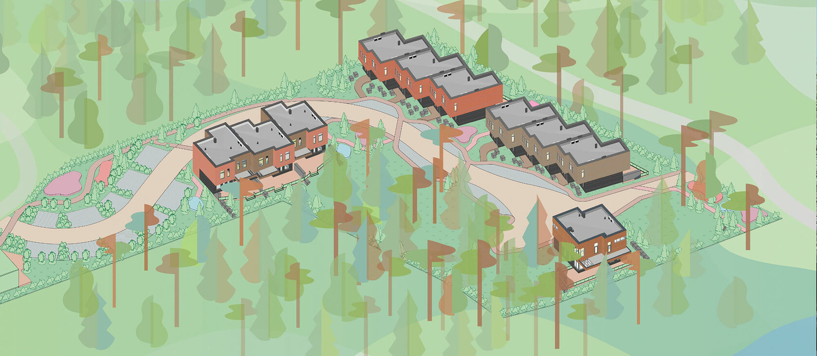 Генеральный план и архитектура нацелены на чёткое разграничение приватных и общих зон, организации индивидуальных открытых зон отдыха для каждой семьи и общих пространств и площадок.