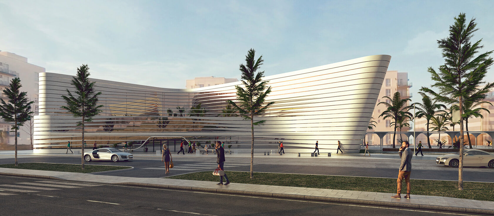 В качестве формообразующей идеи выбран образ камня, обточенного водой. Мягкие очертания обнажают спокойствие и умиротворение, царящие внутри здания. Динамичные контуры фасадов образуют навесы и террасы в тех местах, где того требует внутренняя функция, а горизонтальные полосы из искусственного камня местами утоняются, открывая панорамные виды или обеспечивая естественное освещение/
